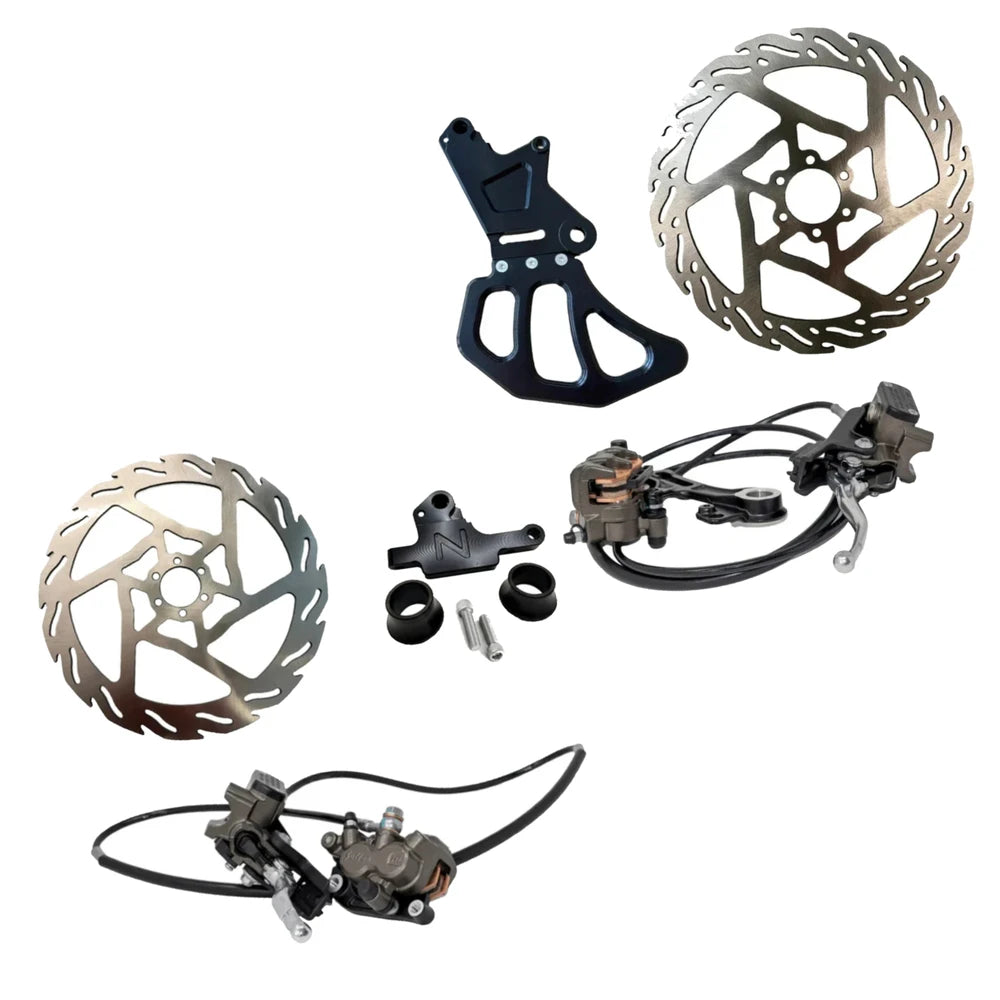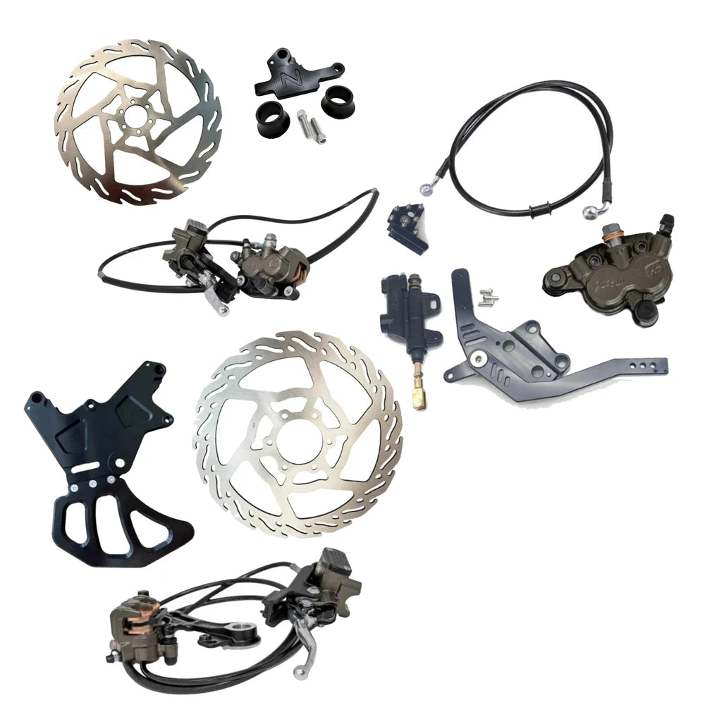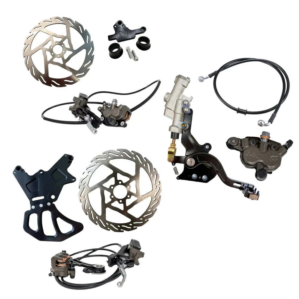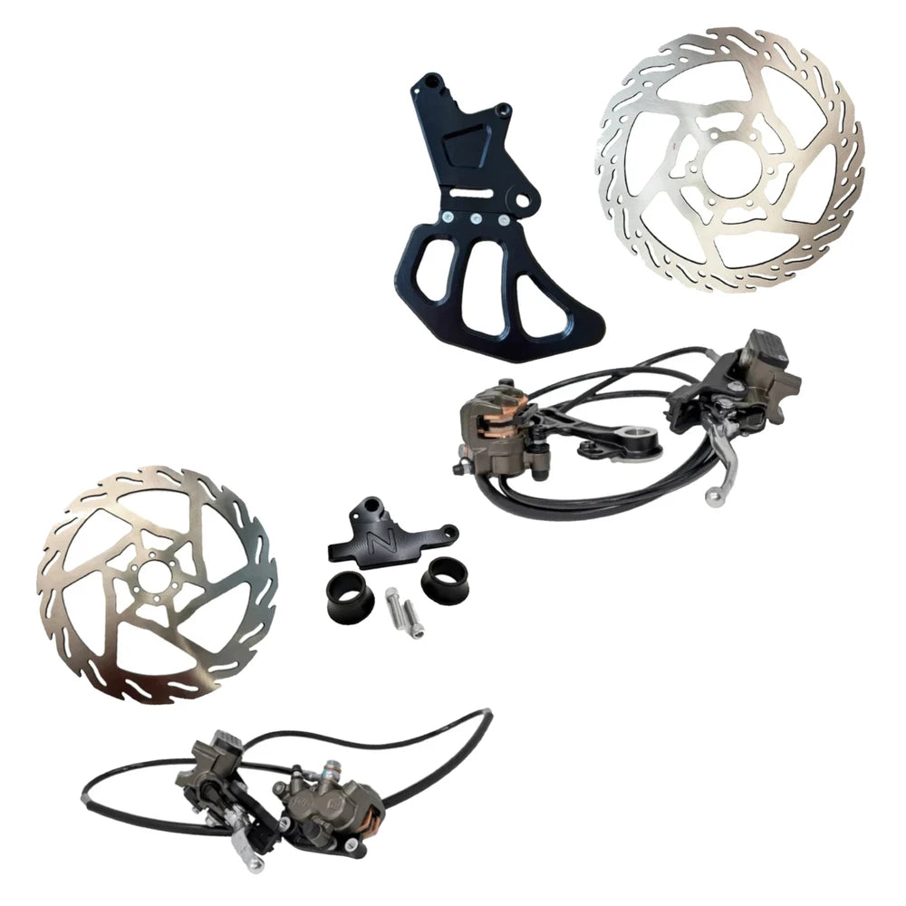 This kit includes a FULL Moto Brake Conversion for your Surron Light Bee, Eride Pro SS, or Talaria XXX MX3 MX4. The full kit includes, 1 Dual Caliper Moto Brake Setup, 1 Moto Foot Brake Setup, & 1 Front Moto Brake Setup.